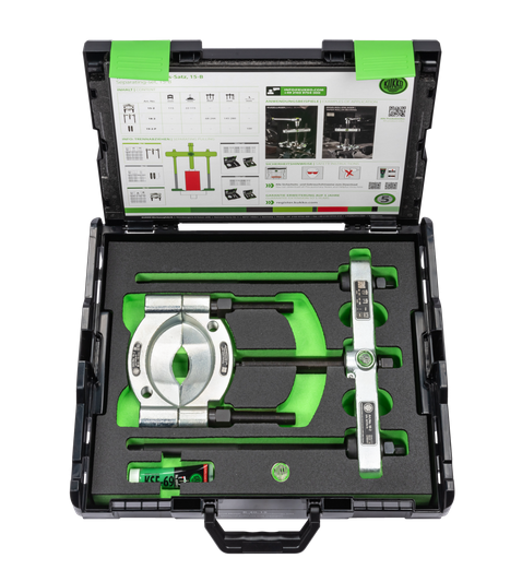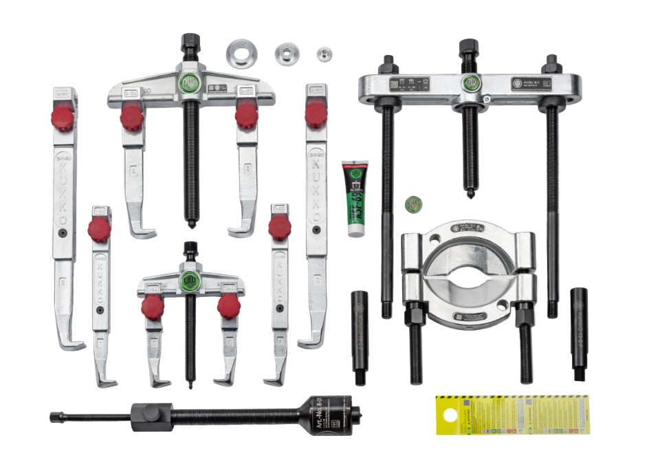 The set facilitates the assembly of seven different puller models through the combination of separators, mechanical and hydraulic spindles, pulling jaws and extensions.